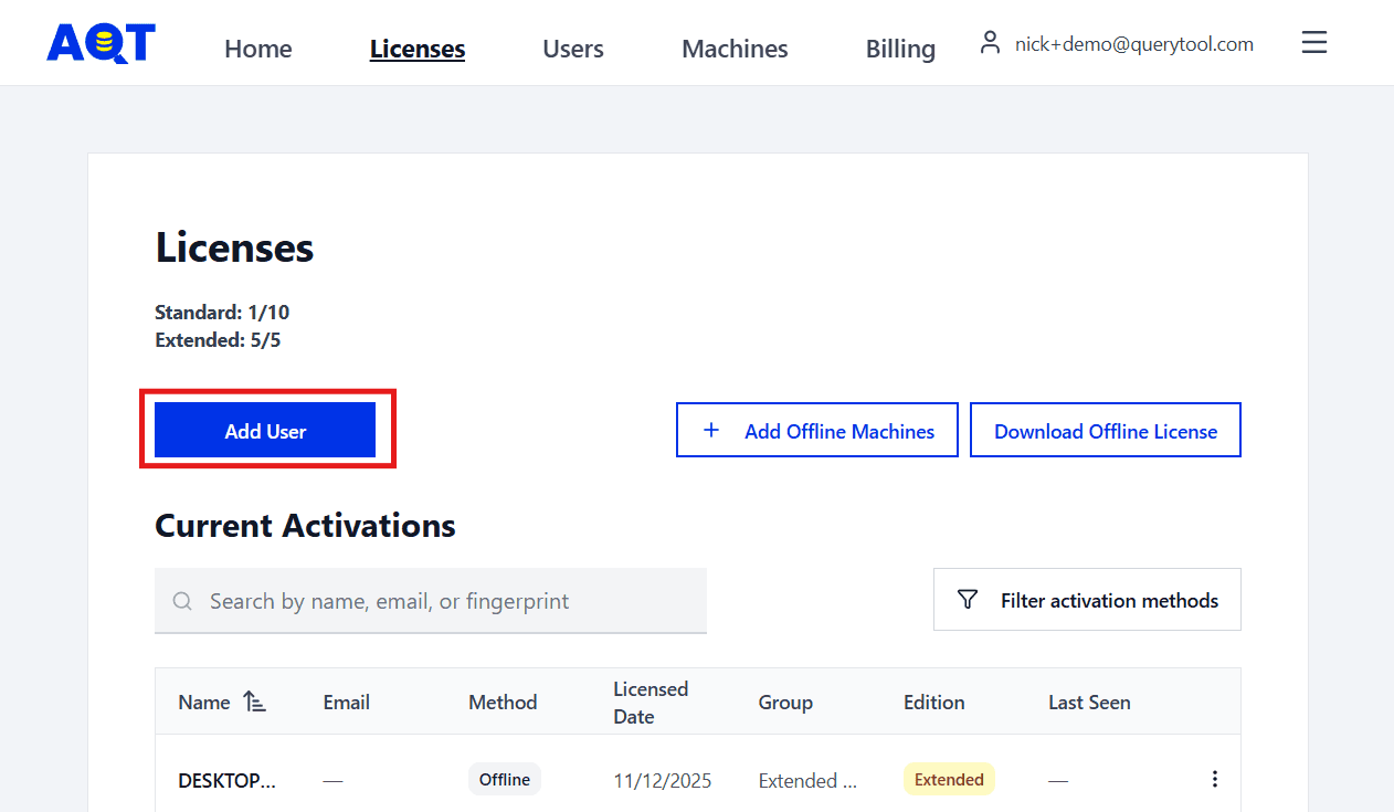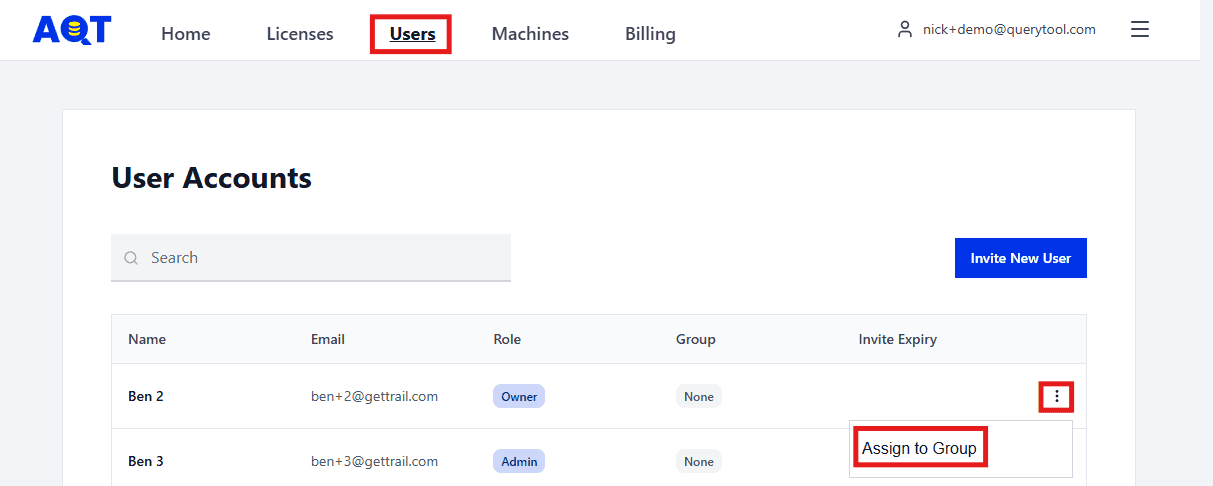 If a user has already been added to the AQT License Portal, but does not have AQT access (due to not being assigned to a license group), there are two ways to give them access.