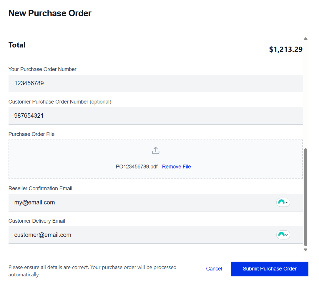 After you submit a purchase order, the license allocation for the customer will automatically be increased based on the number of licenses purchased. A confirmation email will be sent to the Customer Delivery Email you provided when submitting the purchase order, and the Reseller Confirmation Email will be copied into the delivery.
